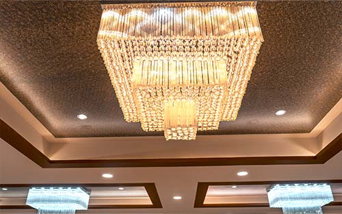 hall's magnificent crystal chandeliers creates a luxurious atmosphere.